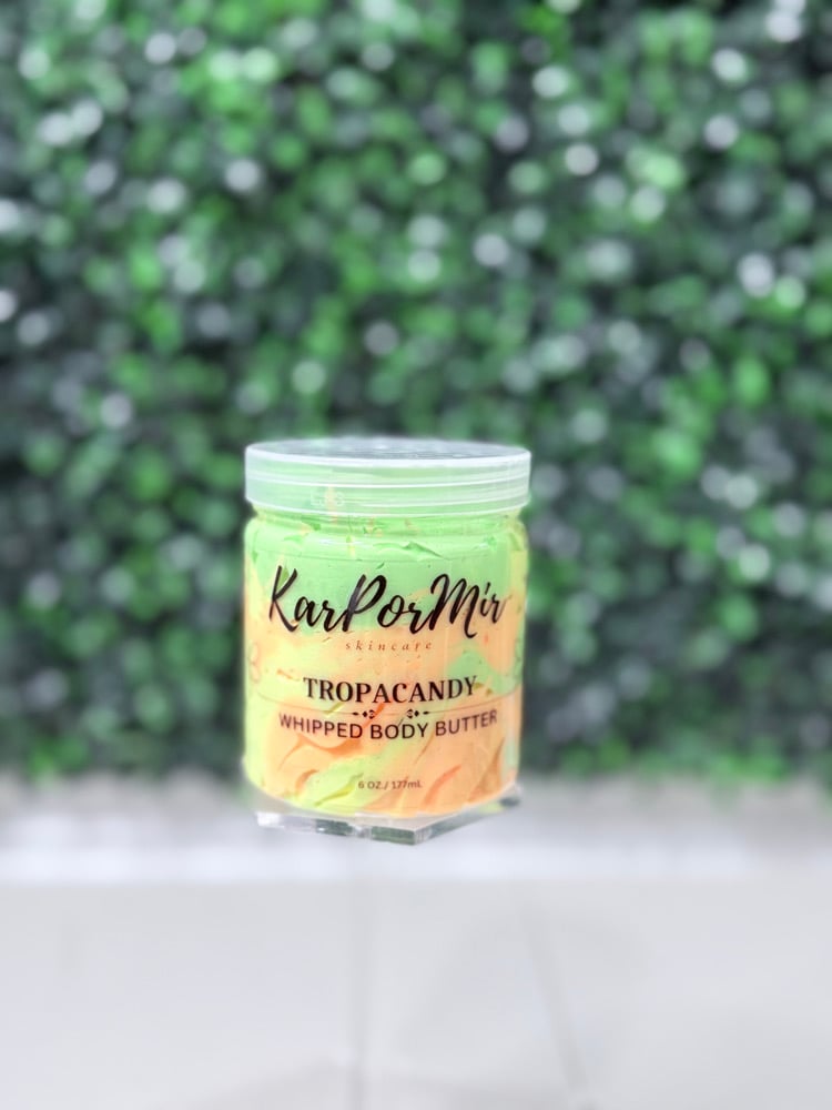 TROPACANDY is our take on SUMMERTIME in the fall! In short: Our whipped body butter will leave you smelling like a luxe fruity-citrus cocktail meeting a nostalgic sweet treat, wrapped up in warm woods and vanilla. Like a sparkling citrus drink on a summer patio + a hint of candy sweetness, settling into a soft woody/vanilla finish.
